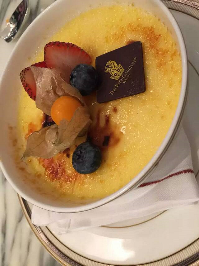 精致高档、典雅奢华的传统法式餐厅!丽思卡尔顿是世界著名的奢华连锁酒店品牌,丽思卡尔顿里面的东西都给人一种尊贵的体验,而在澳门里面也有一家丽思卡尔顿酒店,而除了酒店住房以外,这里的餐饮也是非常不错的。就位于丽思卡尔顿酒店的一楼就有一家丽斯咖啡厅,虽然说是一家咖啡厅,但其实是一家非常正宗的法国菜餐厅。到这里的交通非常便利,乘坐银行的免费穿梭巴士,下车后再步行10分钟就可以到达了,其实餐厅很好找,不过由于银行度假村比较大,所以可能走路要费点时间。餐厅的装修风格也是无可挑剔的,简约时尚,却不失华丽典雅,美丽的黑色水晶吊灯,再配以白色的桌布,非常美丽!桌子上还有一朵美丽的紫色蝴蝶兰做装饰,实在太高贵了。而餐厅里面的服务员也都非常有礼貌,从进入餐厅,到点餐,到上菜,都一丝不苟,能看得出丽思卡顿对员工的培训是非常严谨专业的。而这里的服务员多为外国人,而客人都多数是外国人。就算不会英文也不用担心,因为这里的菜单都是中文、英文、法文三语结合的。这里的人均消费还是能够接受的,一份4道菜的晚市套餐加上服务费就大约500多左右,有龙虾浓汤配虾片、法式牛扒配番薯泥、焦糖布丁等等,一个人吃肯定吃不完,可以两个人吃,再单点其它的菜式,人均也大约400多左右。那个法式牛扒肉质很好,口感丰富。而焦糖布丁的甜度也很适中,布丁滑不溜的,很棒的甜品!这是一家性价比不错的法国餐厅,值得推荐噢!