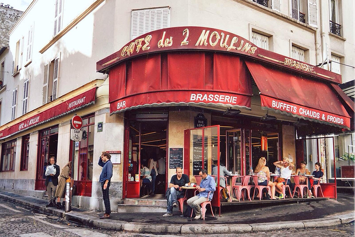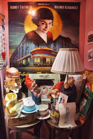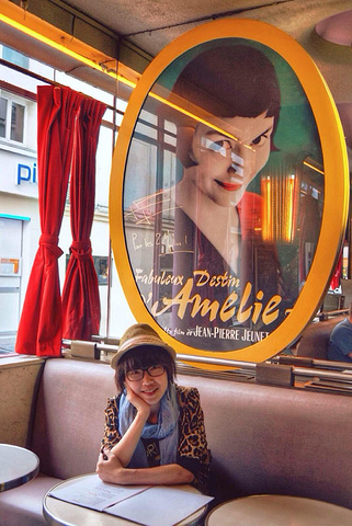 来蒙马特的重点并不是圣心和lass='a_poi_link' href='/poi/4359254' data-beacon='text_link'>红磨坊,而是为了寻找《天使爱美丽》中的双风车咖啡馆。双风车咖啡馆建于1912年,因附近的Moulin Rouge和Moulin lass='a_poi_link' href='/poi/4358984' data-beacon='text_link'>de la Galette而得名(Moulin在法语中是风车的意思)。从lass='a_poi_link' href='/poi/26552530' data-beacon='text_link'>Blanche地铁站出来,沿着lass='a_poi_link' href='/poi/4359254' data-beacon='text_link'>红磨坊旁边的lass='a_poi_link' href='/poi/10036820' data-beacon='text_link'>Rue Lepic往上坡方向走5分钟左右,即可找到这家小馆。走进店内,首先映入眼帘的是一张巨大的《天使爱美丽》海报,店内的装潢是属于典型的5,60年代怀旧风,铁质电风扇在芥黄色的天花板上旋转着,像极了电影中的场景,另外他们家的食物和饮料也绝对不会另人失望。