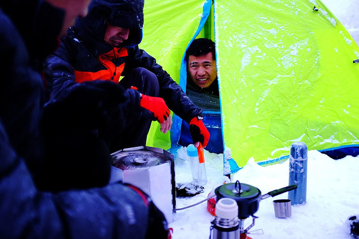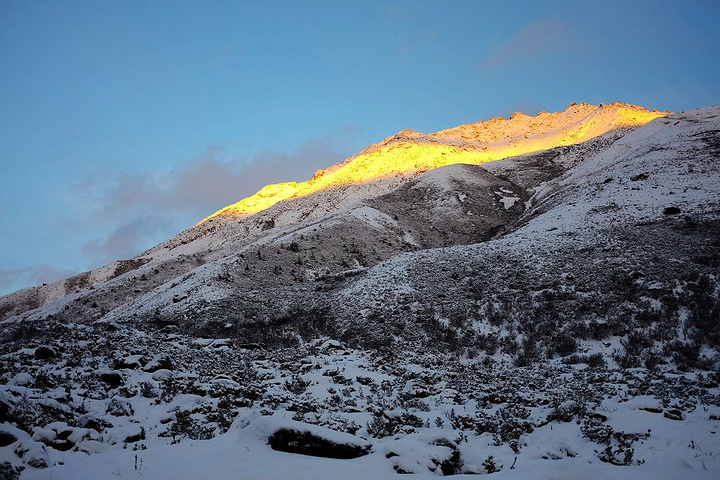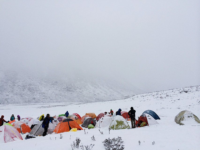 扎好帐篷大家就火速钻进了各自的睡袋~~冻的有些人饭都懒得吃了~ 就在我们为这糟糕的天气郁闷之时,天空突然开始放晴~蓝的发亮的天空出现在我们眼前,紧接着日落照金山的镜像遍出现在了我们的视野里~呼喊吧,小伙伴们。PS:今天徒步了8个小时左右 逆袭一下