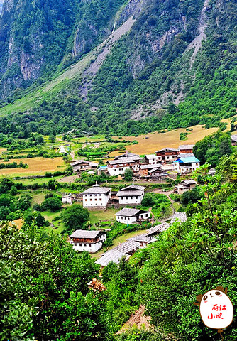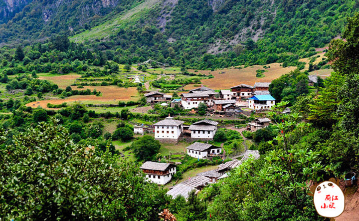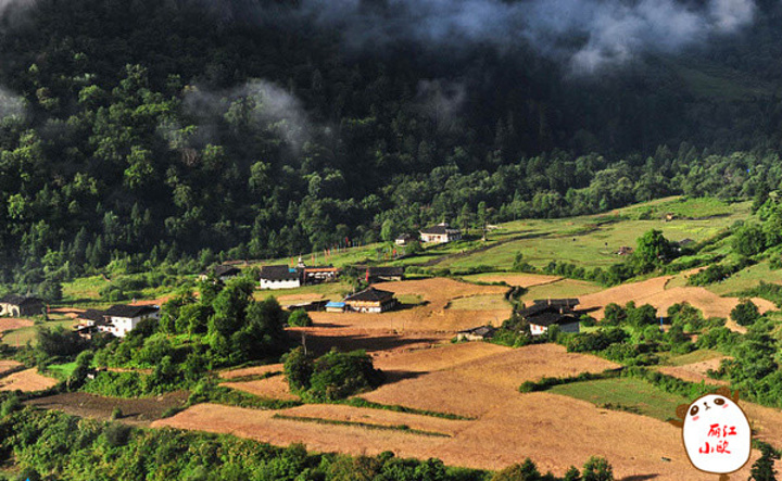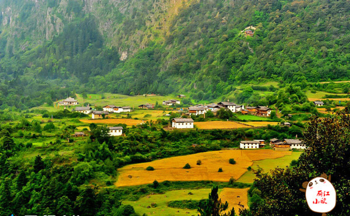 雨崩村绿色草甸和金黄青稞如同一块色彩丰富的美丽画布,白色的藏式民居点缀在绿黄相间的几何图案中,让这如画的村庄更加美伦美奂。