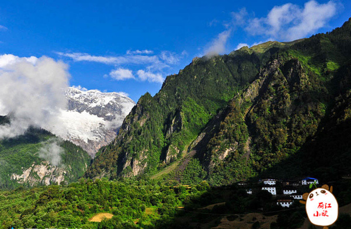 雨崩上村位于陡峭的山涯下,白色的藏式建筑在蓝天白雪的称托下显得更加醒目。