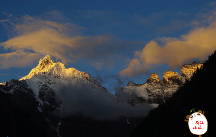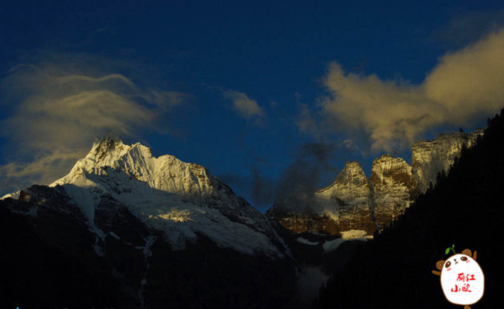 在雨崩内拍到的日照金山,最先染红的是神女峰的山尖,就象带了一顶金色的皇冠,在深蓝色的天空下光芒四射,无比耀眼。不一会神女峰和五冠峰都被染成了金色,雪山上空的朝霞也呈现出金黄色。