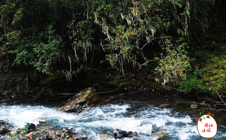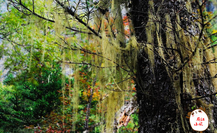 这是雨崩上村去大本营路上经过的原始森林,原始森林的古树上都挂满了一丝丝的松萝,据说这种植物只有在空气质量十分纯净的地方才能生长,这也反映雨崩的生态十分的良好。