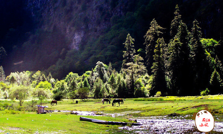 原始丛林中的高山草甸 ,沐浴在清晨金色的晨光之下,清澈的小溪在草甸间静静流淌,牦牛和马匹在草地上静静觅食,一幅充满诗意的风光写真画就呈献在我们眼前。