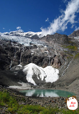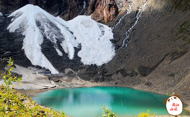 夏天冰湖的水呈献出碧绿色,就象一块绿色的翡翠镶嵌在雪山峡谷之间。