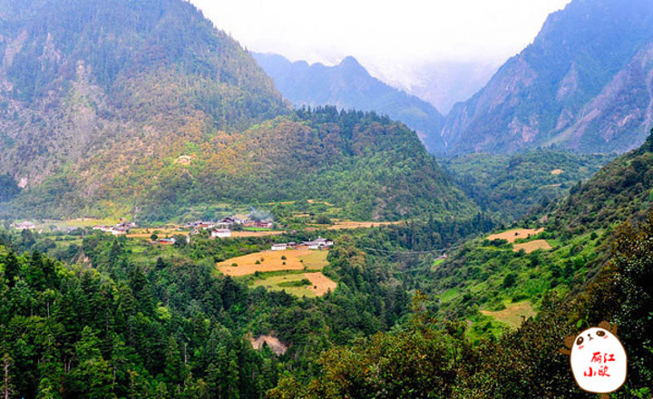 从雨崩上村拍下村全景,雨崩村就位于山谷间的平坦的草甸上,只是现在的颜色由春天的绿色变成了金黄色!