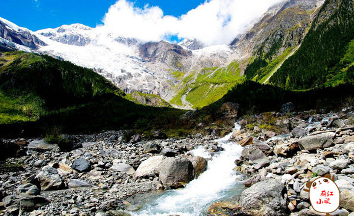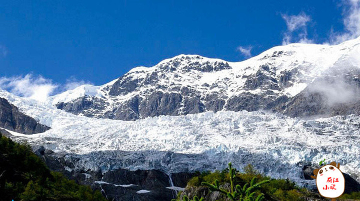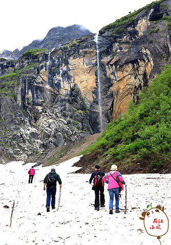 神瀑下的冰川终年不化,即使到了夏天,仍可穿着短袖在冰川上徙步,感觉十分奇妙 神瀑下的冰川在阳光的照耀上呈献出耀眼的银白色,踏着白色的雪地向神瀑前行!