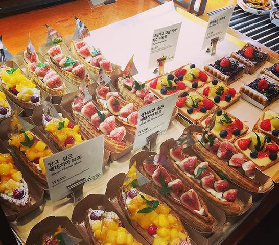 如今梨泰院已经成为首尔必游旅游景点之一。但众所不知就在梨泰院的前一站汉江镇(한강진역)也有很多好玩的,比如大家所知的pssion5就在汉江镇3号出口。而且沿着往前一直走不到10分钟便是梨泰院。 passion5是家高级甜品咖啡店。从外观上来看像办公楼的大厦,不知道的人以为是个办公楼,所以找的时候要注意了。门口旁边有个门卫室可以帮忙驻车的,相邻的这幢建筑物进去左转便是。营业时间是:07:30-22:00 内部有琳琅满目、大大小小、各式各样的玻璃展示柜。满眼望去都是各种精致的甜点,空气里漂浮着香甜浓郁的甜味,真是视觉和嗅觉上得双重享受。Passion5主要分为面包、蛋糕、饼干和意大利冰淇林四个区域,每一个区域都有数十个品种。那么多种类的甜品,让人无法选择。