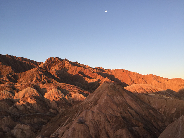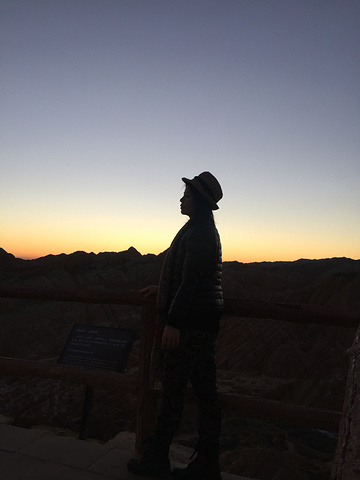 第一站,早上7点半,我们重返七彩丹霞看日出!“起伏的山丘,在拂晓前暗淡的天光中,显得宁静而典雅,深灰色柔和的山丘映衬在浅灰色的天幕上,有着一种孤寂的美。”【此处百度抄袭,小学没学好,文采不好,就此带过】在深蓝深蓝的天空里,东边泛着金黄的霞光彩带,太阳已犹抱琵琶半遮面,蠢蠢欲动,准备探出头来照亮这个世界。在西边的天空,一轮明月高高挂,皎白的月色,毫不逊色于太阳,像一位外柔内刚的女子,非要和刚烈直率的太阳一较高下。【好厉害,这段话居然是我自己写的内心感受】 七彩丹霞看日出,是在1号观景点。8点18分,我已独自一人走到看日落的最高点,将背包什么的放在栏杆上,把手机架在上面调定时自拍。【此处儿童不宜,手机掉了就捡不回来了,呜呜】8:21,太阳开始探出头来了,天空的颜色也有了明显的变化,有点蓝又有些紫,朝阳的霞光范围越来越宽广。8:28,朝阳已露出三分一的脸出来了,它躲在远处的“神猴观海”奇石怪山那里,慢慢地,不娇不急地把金黄色的阳光洒在守候已久的丹霞地貌之上。此时,月亮姑娘仍然绽放着自身的光彩,好不畏惧太阳的光芒。温柔的朝阳光芒洒在七彩丹霞之上,丹霞之上高高挂在洁白的月亮。【此时,我又悔恨自己没有单反相机了!这么美的风景,手机把月亮拍渣了。】 让美景停留,让时光停留,此处省略日出美景五百字。。。