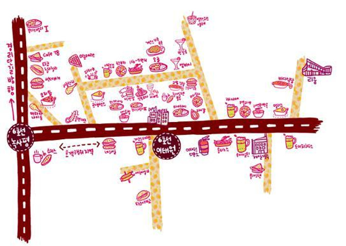 梨泰院美食地图 因为有很多外国人住在这里,所以各国的美食料理和特色饭店都能在梨泰院找到