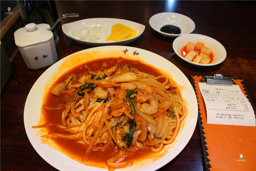 这是贴在门口的菜单,最有名的就是第二个炒乌冬面,现在已经涨到8000韩元了。但是有个问题,为啥这个店翻译成“中和”而不是“中华”!哈哈~
