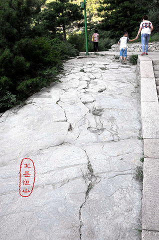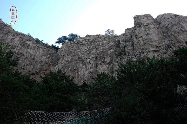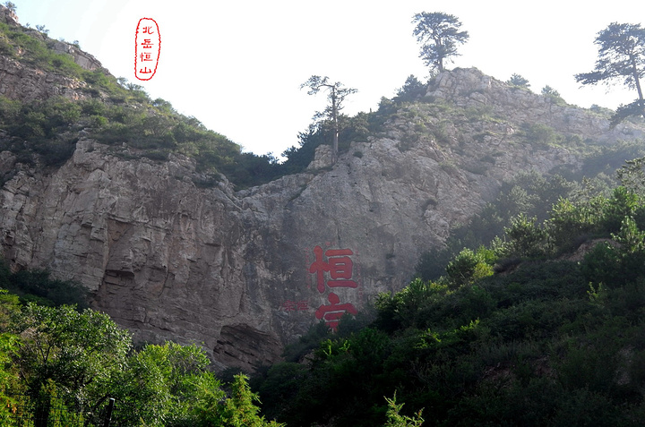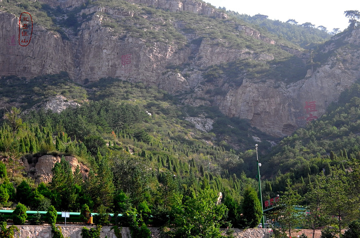 在这儿正式检票进景区,穿上护膝,拉开登山杖——前进,进山不远就可以看见有名的恒宗两个大字,此乃明成化三十年大同知府张升手笔,两字总高十三米,宽六米,说是“横直如栋梁,点捺大如牛”。但到字跟前去的路已经被封了,只能远远的看。