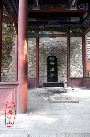 在接官厅旁一座亭子,名玄井亭,这便是恒山著名的“苦甜井”。亭内两井,相距很近,而水质一甘一苦。唐玄宗曾赐额“龙泉观”。 现苦井被填,甜井还在。