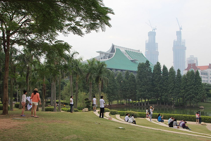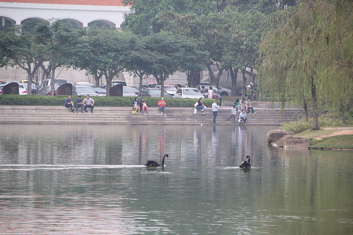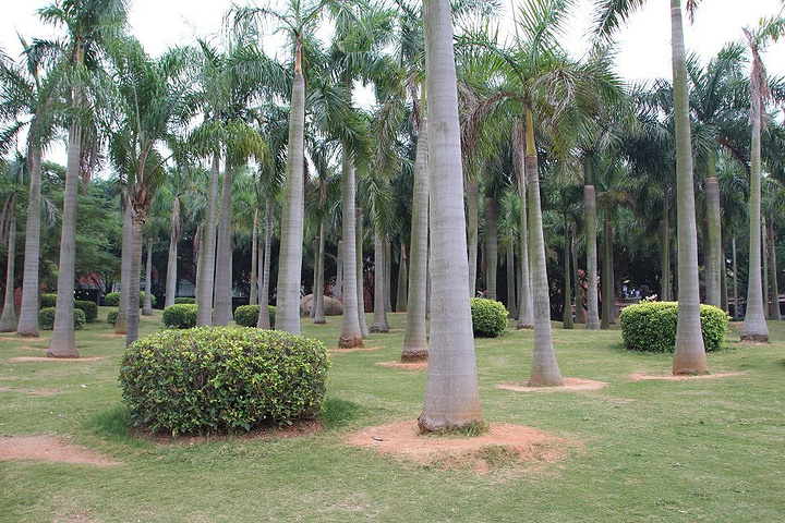 湖的四周是碧绿的草坪,草坪上长着一排排高大的树木,有芭蕉树,有椰树,还有棕榈树,稍不留神,还以为自己来到了东南亚的热带雨林之中。。。