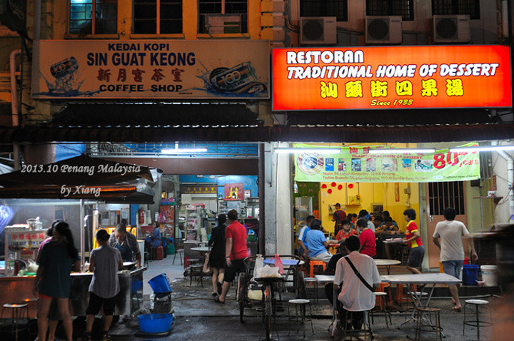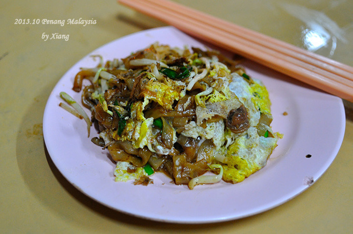 在酒店休息了一会,转眼又到了晚饭时间。既然到了槟城,又怎么能错过汕头街的“四大天王”?被称为汕头街的Lebuh Kimberly街,是槟城的一条外表古旧的老街,但是因为有“四大天王”的存在,所以每天总是有很多游客都慕名而来。这里所谓“四大天王”就是Lebuh Kimberly街上的四间店:新月宫茶室、汕头街四果汤、天皇鸡脚粿条汤、汕头街权记鸭粥粿汁专卖店,全部都是在天黑之后才会摆出来营业。尽管我跟婷婷只有两个人,食量有限,但我还是坚持把四大天王都尝了个遍。 “四大天王”之一,是新月宫茶室的虾蛄炒粿条。粿条是闽南语,炒粿条其实跟广东的干炒河粉差不多。炒粿条在槟城随处可见,这间店的粿条炒得既美味又不油腻,而且会在炒粿条中加入爽口鲜甜的虾蛄肉。