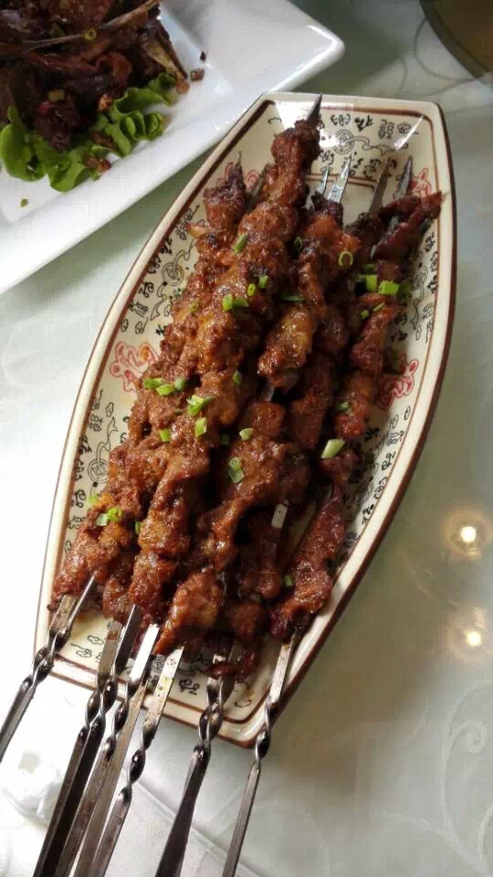 羊肉串,都是很大的一串,虽然价格也比较小资,但是吃得放心,是真羊肉。肉质很嫩带有一丝膻味,正和我的口味,喜欢一点肥的