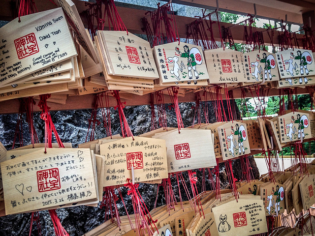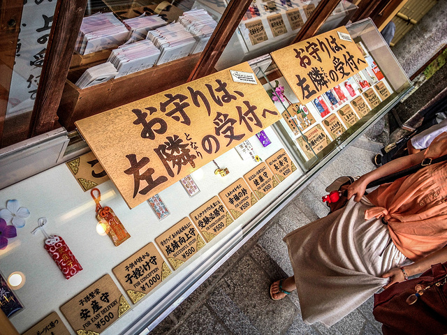 寺庙里面,有各种附身符可求。还能求签,有一个箱子,你扔200JPY之后,抽一道签。在寺庙求签,如果抽到不好的签,你可以将它绑在树上(会设置专门的地方),系在上面就能化解,好的签就会带走。日本人只相信好签,不好的就当没求过。