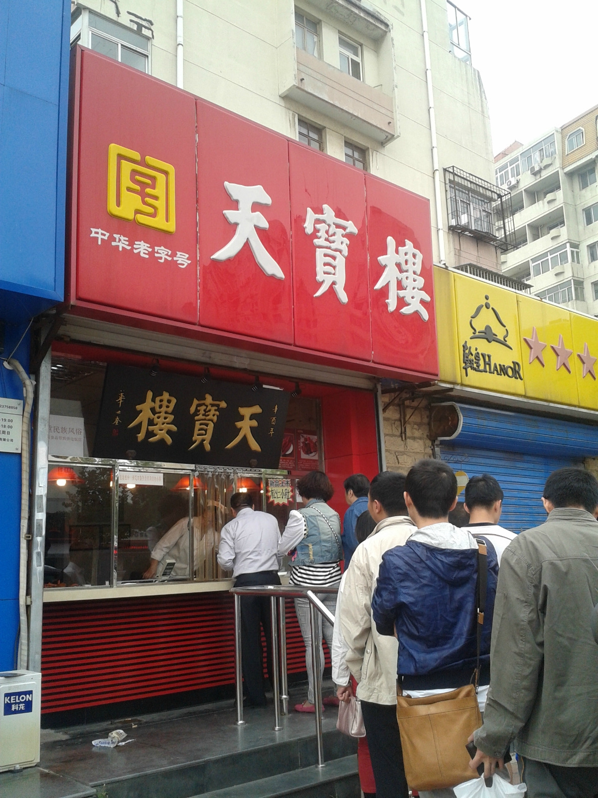 天宝楼,号称天津的老字号,主要经营酱菜,品种好多,牛肉,肘子、鹌鹑蛋,这间店在居民区里,华苑路上,只有一个店员,大家都是在门口排队的,队伍很长,,店员是先下单,收银,再称东西,然后打包,进度非常慢,因为大家都是买非常多的,但是所有人都不急,就这样慢慢地等着,小孩也是,很有耐心。