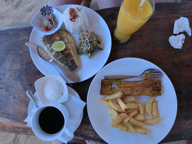午餐是浮潜公司配的,大家可以在餐牌上点一个主食和一杯饮品。 陈先生点的是烤鱼餐,我的是竹叶烤鸡和薯条。 后悔点了咖啡。都是咖啡渣!