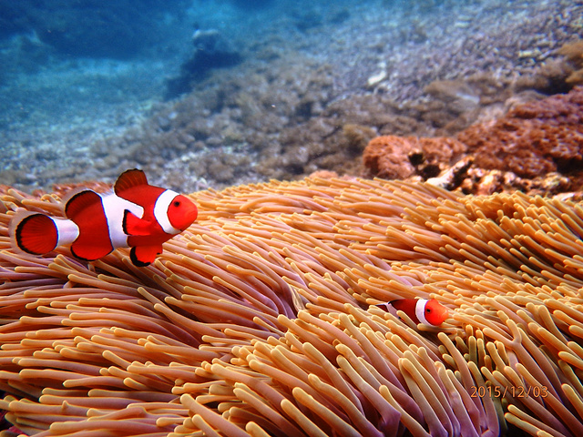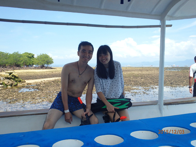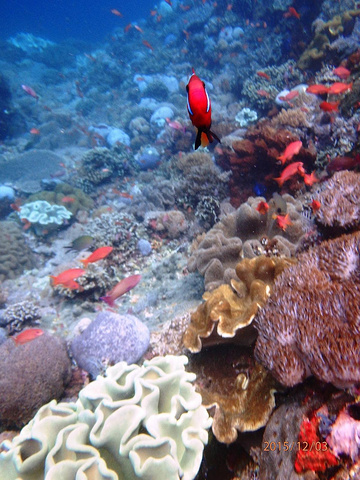 对于第一次浮潜的我,很是紧张! 浮潜点是不碰地的!不能碰到地,不知道会不会沉下去,也不知道怎样用管来呼吸。 刚开始只能用手扶着船边试着潜。大家都已经浮潜了一段时间,我仍在船边学着如何呼吸! 陈先生已经看不下去了,游到我的身边,跟我说:你快放手出来游啊!你这样是浪费时间。 我各种解释之后,他跟我说:海水是可以将你浮起的,快放手出来吧。 结果.....海水真的可以将我浮起(请问我的物理是学得多差) 终于在放手之后开始享受的我浮潜,海底世界各种漂亮啊!!!