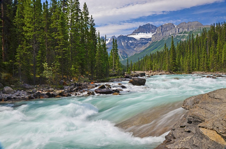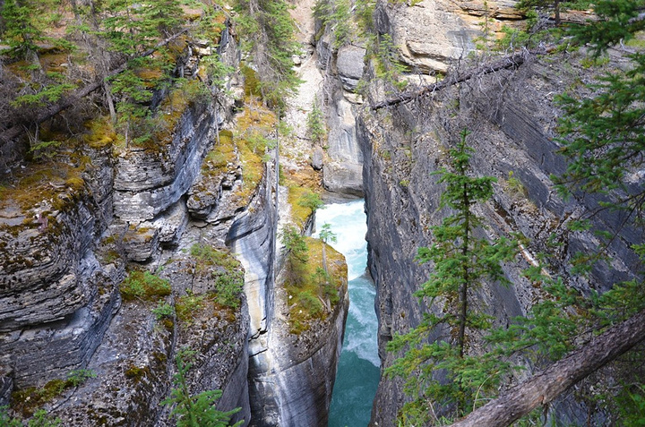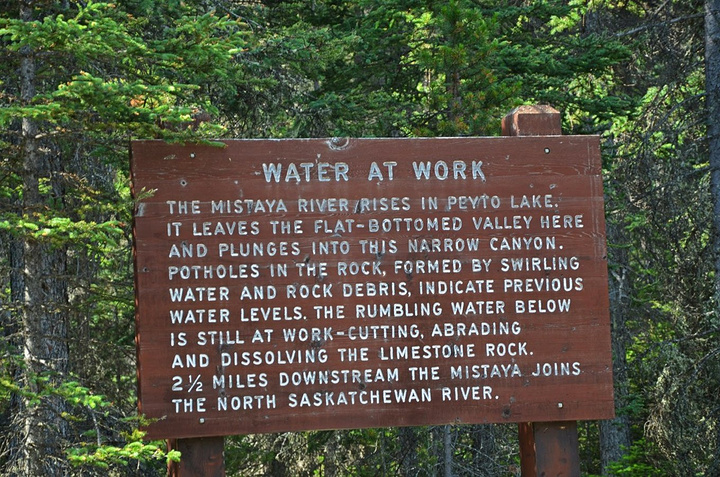 米思塔亚峡谷也是落基山地区三大峡谷之一。峡谷中的米思塔亚河源自佩托湖里的冰川融水,上游本来水势徐缓,但穿出密林后从高达三四十米的岩缝间跌落下来,变得十分湍急。由于水流长期刻划和侵蚀,形成了如今米思塔亚峡谷奇特的地层风貌,相信这种力量将在千百年后仍将延续。