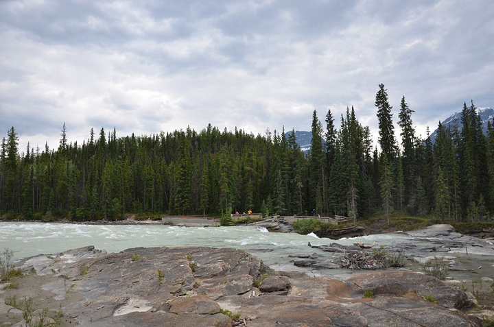 五点钟我们离开森瓦普塔瀑布,前往我们在冰原大道上的最后一处景点阿塔巴斯卡瀑布 Athabasca Fall。 阿塔巴斯卡瀑布的位置已经很临近贾斯珀镇了(距离不足30km),但它不在在冰原大道上,而是在93号公路的支路93A上。不过也离开主路不远,就在两路交点附近,如果想去往天使冰川Angel Glacier的话,沿着这条路继续向前就可以了)。 停车场就在阿塔巴斯卡河边,很快就到了瀑布的观景平台前。