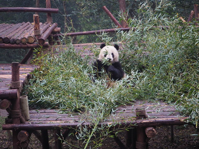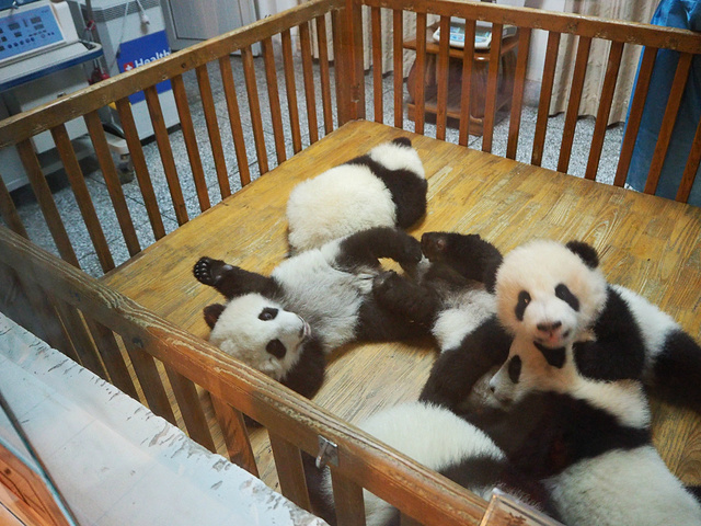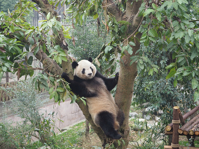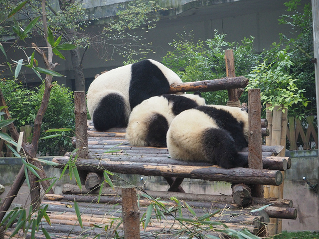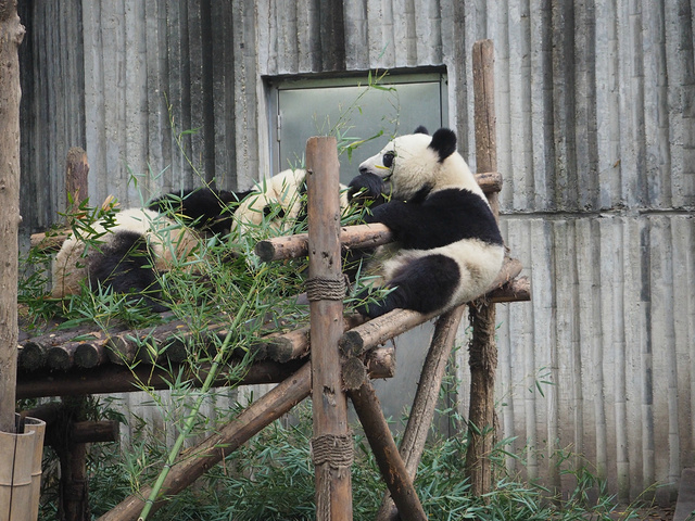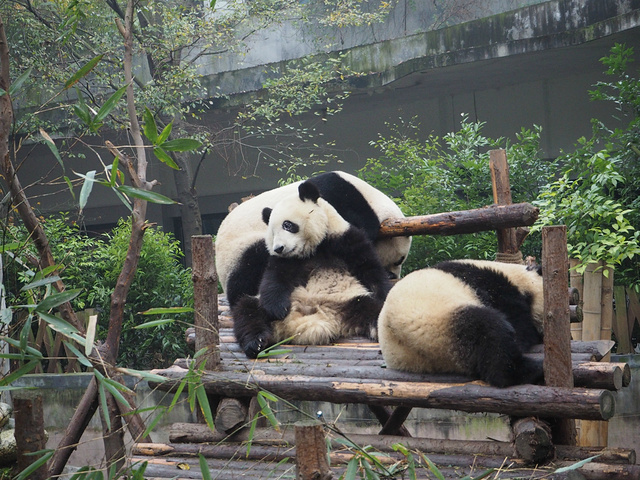第五天我们就去看国宝啦啦啦。 一直只能在电视上看熊猫,今天终于可以亲眼近距离观看这呆萌的国宝卖萌了。一大早看到的第一只熊猫就是一只勤奋的成年熊猫,他一直都在来回散步,而他的小伙伴们还躺在高台上吃早餐呢。然后去到月亮产房里看到好多熊猫宝宝,在那慵懒地打着架,可爱得不行。可惜没看见喂奶的情景。在产房外头就看到几只熊猫宝宝在那打架,还有一只在到处爬树。停留了二十多分钟后,继续往回走,看到不同年龄段的熊猫,成年的都在吃东西,老年的都在睡觉,还有一只在拉耙耙。最后再到熊猫博物馆里了解熊猫的介绍、习性、标本等等。大半天下来,感觉太棒了,羡慕成都人民可以经常来看熊猫宝宝啊。。