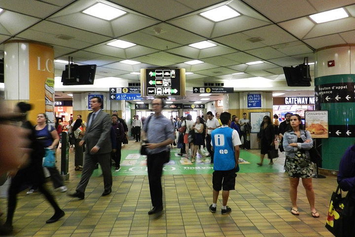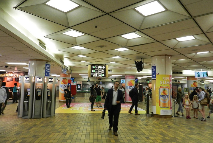 从Osgoode站坐地铁,坐两站便到了联合车站Union Station。多伦多联合车站是全加拿大最大的火车站,也是北美六大联合车站之一,于1975年被列为加拿大国家历史遗迹。它不仅造型雄伟庄严、历史悠久,更是一位见证人,记录着多伦多从一个贸易小镇发展成全国第一大城市的脚步。 由于我们是从地铁站进来的,直接就是下面的站台区,满眼看到的都是步履匆匆的乘客,颇有点国内火车站的感觉。