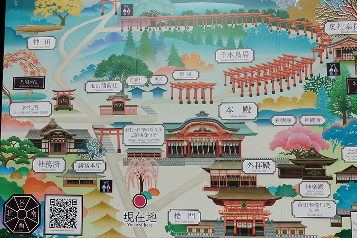来张地图,大社最出名的要数神社主殿后面密集的朱红色“千本鸟居”,密布到山顶,是京都最具代表性的景观之一,当然一般人是爬不到山顶的……