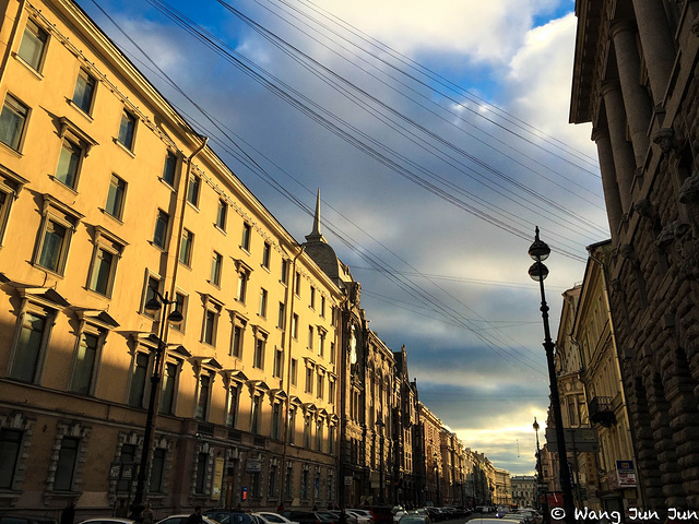 涅夫斯基大街是圣彼得堡的第一条街道,大街的起点和终点都在涅瓦河的拐弯处。 沿着大街走向涅瓦河方向的最后几街区,这里就有几座重要的历史意义建筑。 有许多什么文人咖啡馆。一整天的阴天,太阳终于舍得露脸出来了。 刚好捕捉到阳光晒在建筑上,那种温暖的感觉是立马就能感受到到了,真美~