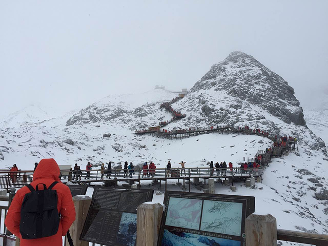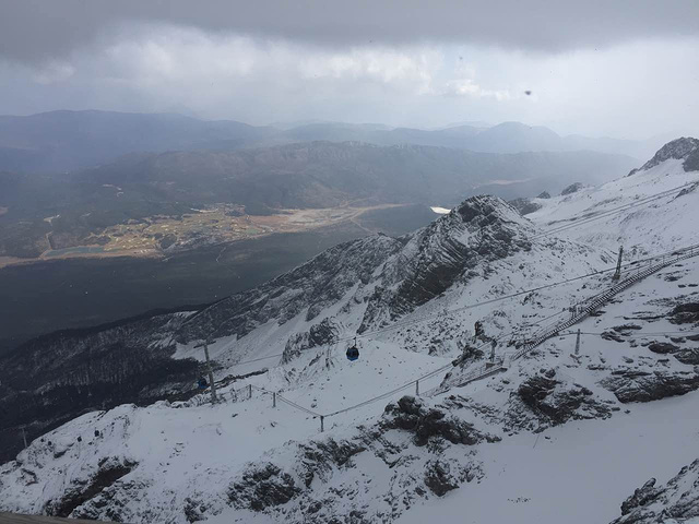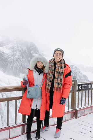首先感谢宝宝冒着哮喘发作的生命危险陪我上了雪山。 玉龙雪山的大索道真的是非常值得一坐,从从山脚的3000米海报到4600海拔只有不到10分钟的时间,而且可以看到从3600米开始植被的消失,欣赏两旁的雪景。 我们上山的那天天气不是特别好,山顶的云雾还是比较大的,加上寒冷的大雪天气,我们只在索道外面照了几张相片就下去了。 四千多米的高原肯定会有缺氧的现象,便携式的氧气瓶是必不可少的,在上山前吃点巧克力增加一下能量也是满必须的。 玉龙雪山照出来的照片都是白皑皑的没有朋友秋天去照出来的好看,但是云龙雪山的雪景还是别有一番风味。