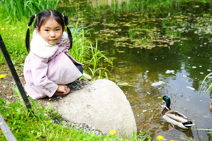 走着走着,突然一只小松鼠从树上跳了下来,好多小孩子都冲过去想和它拍照,可惜虽然这只松鼠架不住人多,赶紧又跑了,我们正在遗憾,旁边一个俄罗斯的妈妈很热情的给了小豆子很多葵花子,还叭啦叭啦说了一通,我们语言上是听不懂,但意外的是我们竟然还是理解她的意思,大概就是松鼠比较爱吃瓜子,用这个来吸引小松鼠,它就会下来了,看来这位妈妈有经验。我们立即试一试,小松鼠没走远,小豆子把手一张开,果然它就主动下来了。