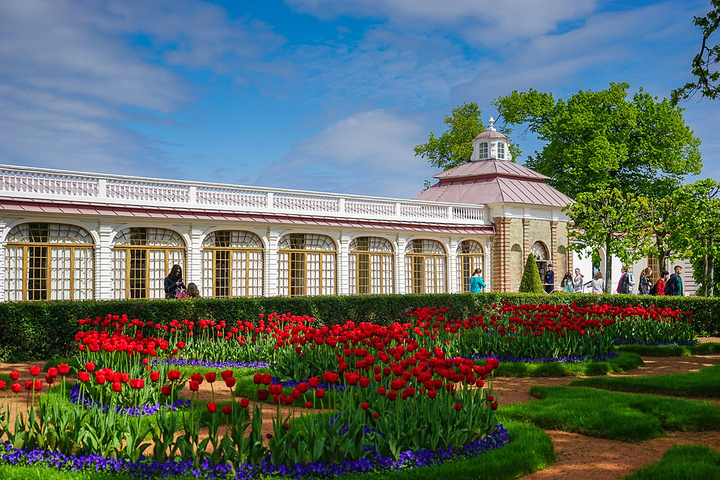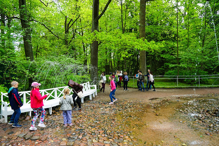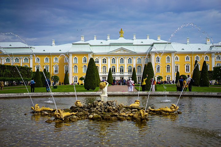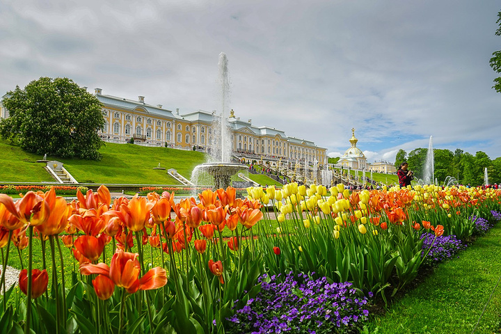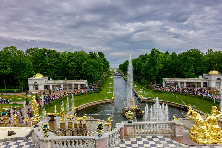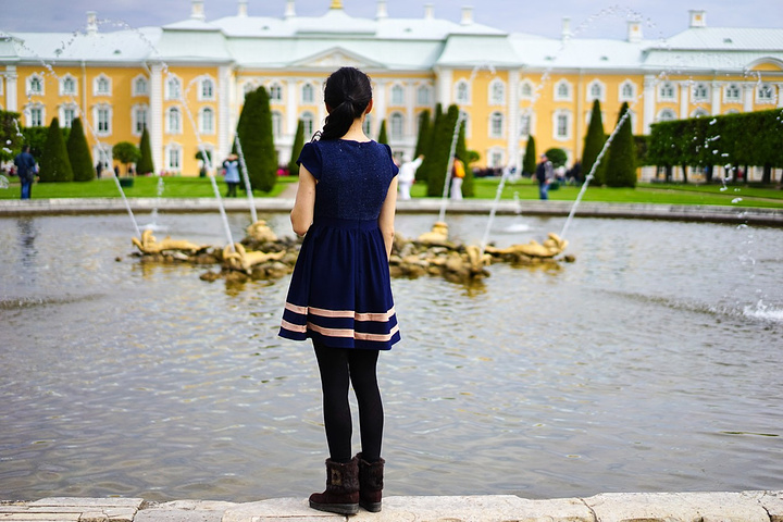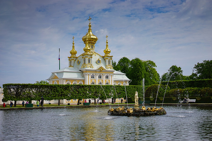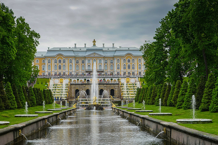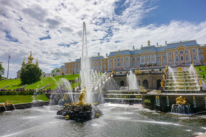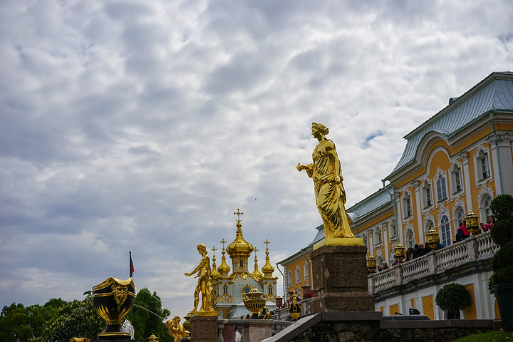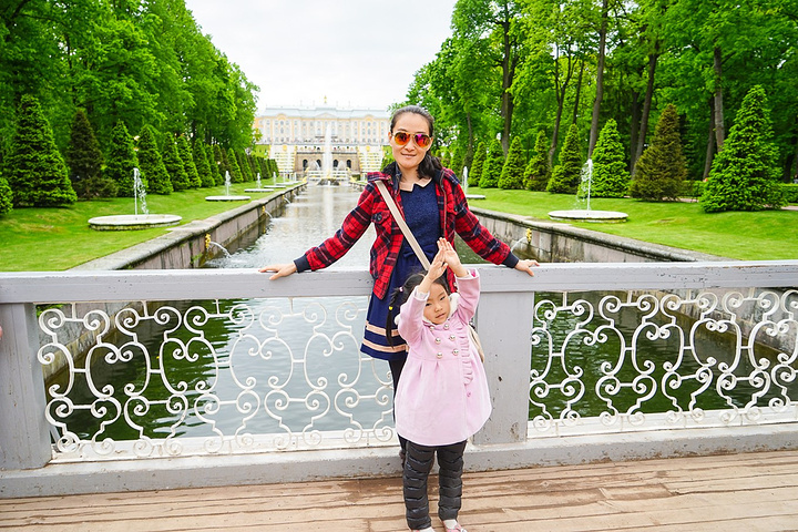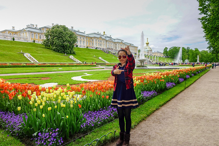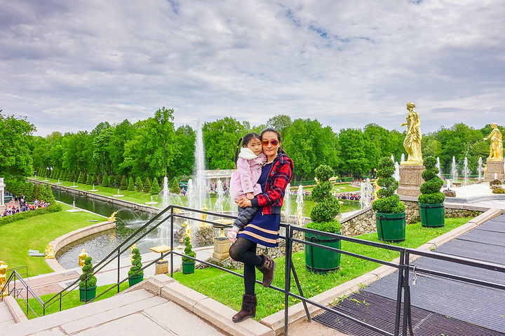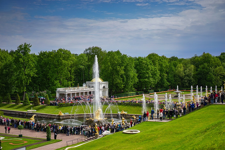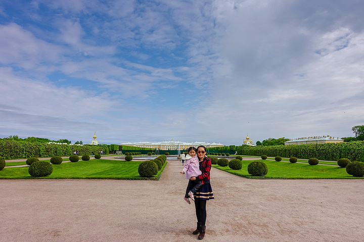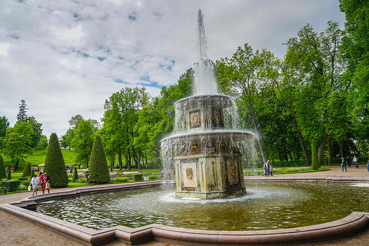 票价是500卢布一个人,只含了花园的票哟,里面的宫殿也是另外收费的。买了票赶紧先进去,赶巧了,我们进去的时候刚好碰上大喷泉的音乐表演,随着音乐的节奏,喷泉也不断的变化,时间是上午11点,可能整点都会有这样的表演吧,大家可以整点的时候来看。