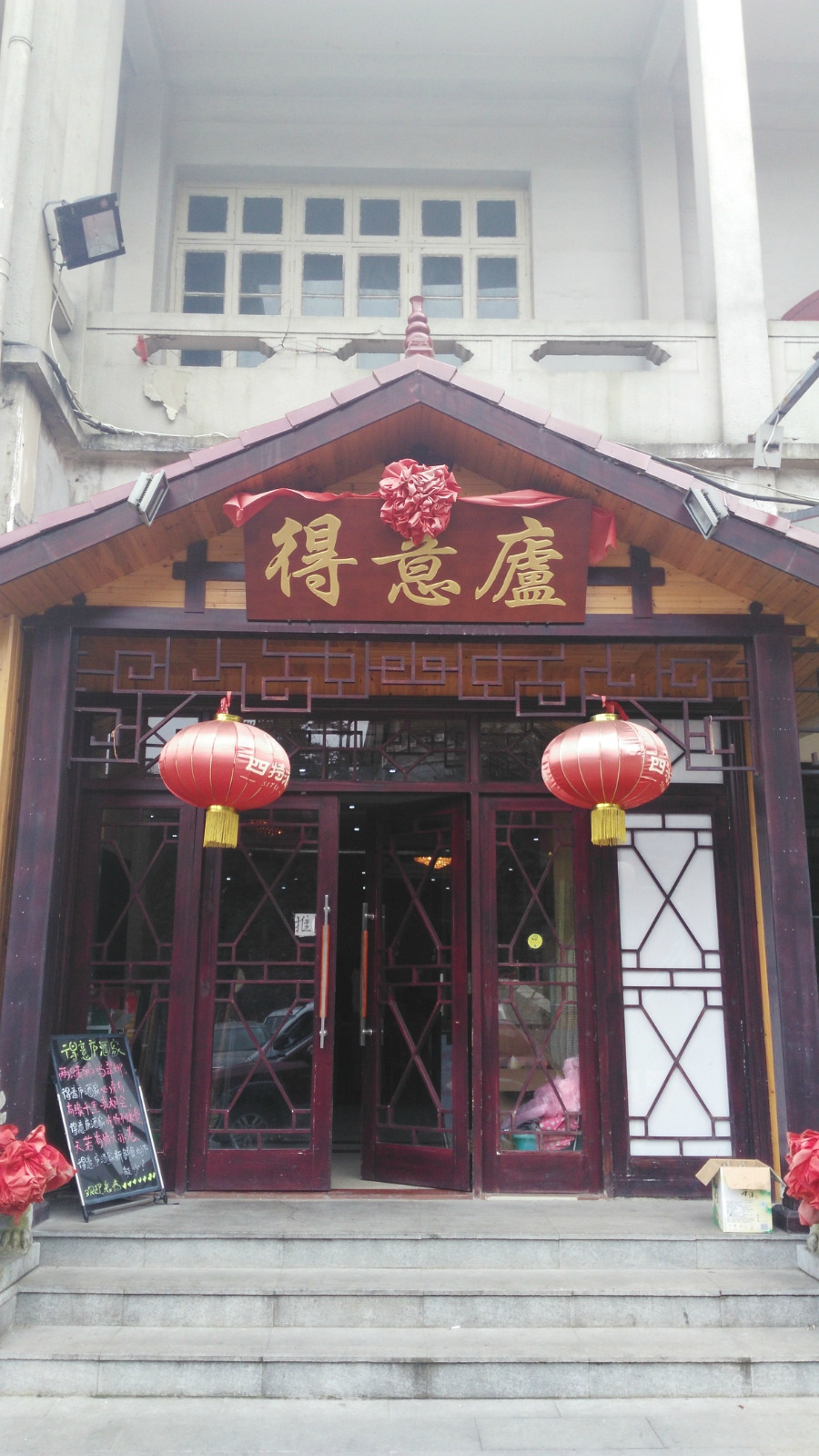 在庐山山上的第一顿饭,搜了一下某点评网,排名第一的是得意庐,看看评论都说不错,于是兴冲冲的跑去了。饭店处在牯岭街上,但是不是沿街的店铺,所以有点不好找。其实就在牯岭街上最大的那个德克士对面,振豪超市旁边,有一条往下的阶梯路,一路往下会看到一个篮球场,就在篮球场旁边。和小院子等饭店毗邻。或者如果你问当地人,灯光球场在哪里,他们也会知道,知道灯光球场就能看到得意庐啦。