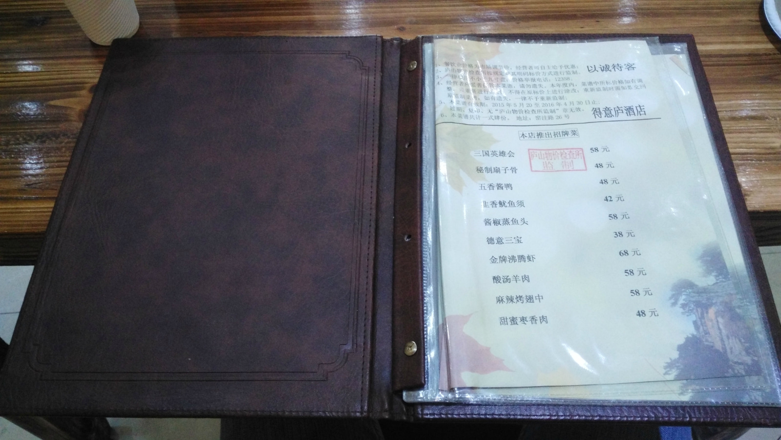 翻开菜单,菜单上是有庐山物价局的章的,所以大家可以放心点菜,而且看过价格也知道还是比较实惠的,没有像五台山黄山那种乱开价的状况。