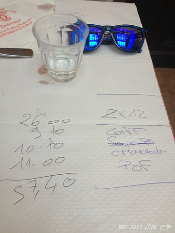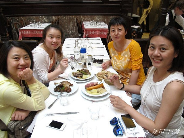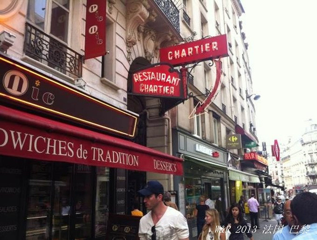 吃了冰淇淋继续往前走,在广场尽头四个人再也走不动了,不是真走不动,而是想吃夜饭了,馋老虫爬出来了,一拍即合,一致目标米其林推荐法国餐厅RESTAURANT CHARTIER,的中文名“能人居”。找到地铁站,换乘一次地铁到达,根据地址在大街上来来回回找,其他门牌号都有,就是跳过“能人居”的门牌号,问了路边餐馆里的服务员,指了方向还是没找到,最后问到开服装店的法国人,很热心地出门指给我们看,原来要从大马路拐个弯到小马路上,就能看到高高悬着的红色店牌了。