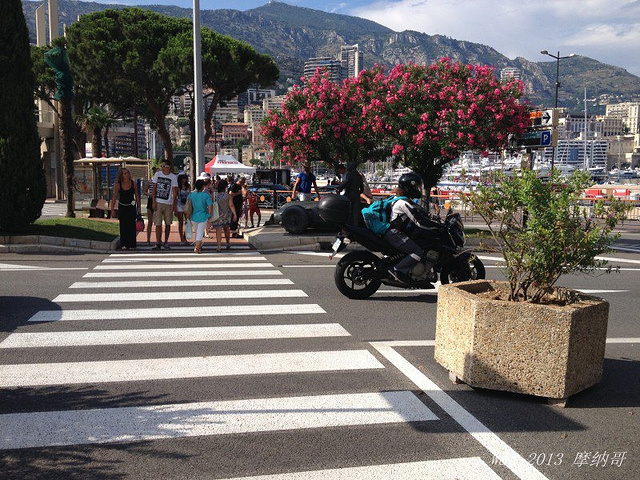 不要只顾着看风景,错过了上山的入口,这是个不起眼的入口,就在F1赛道快到折返点的几岔路口,中间有个小岛,给过马路的行人作停留。下图是从港湾穿过斑马线过来,就能看到上山的入口,入口就是上山的台阶,沿着台阶一路向上,爬到上面,一个很大的广场平台,王宫就坐落在此。
