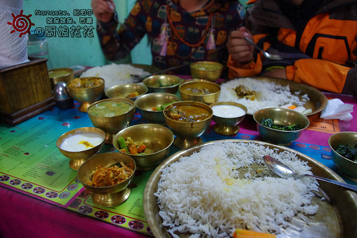 中午吃了一餐尼泊尔当地套餐,味道还可以,超多东西,不同的小碗装不同的菜,白色的是酸奶,有青菜,有咖喱土豆,主食肉类可以选牛羊鸡,还有类似咸菜的东西,还有汤,米饭和蔬菜可以免费续添,价格才180卢比啊,亲。