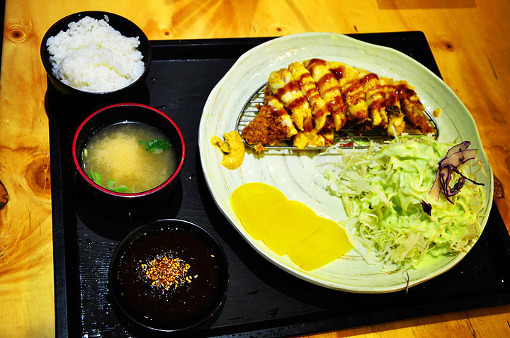 感觉普通的炸猪排比较多,难道放了芝士肉缩水了么。猪排味道很好,推荐!左边一坨黄的是芥末,不要一下吞了,黑黑的酱,味道像梅子酱,酸酸的~