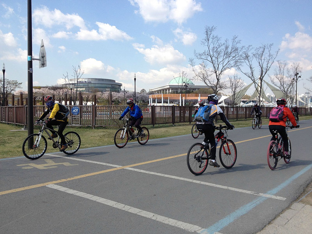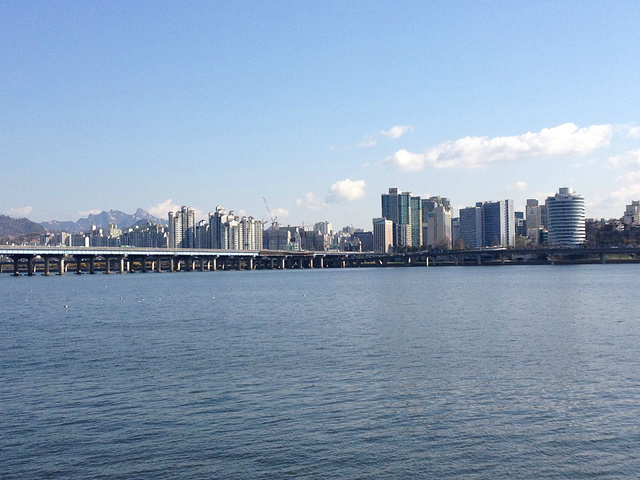 汉江两岸,公园林立。但是在这众多的公园里面,个人认为最好的就是汝矣岛汉江公园,适合谈情说爱,最适合拍电影。。。可能因为大家都喜欢这个汝矣岛汉江公园吧,所以一般韩国人提起来汉江公园那就是指汝矣岛汉江公园,平时韩国人也经常去那里散心游玩。而且,汉江游览线登船的一个点就在汝矣岛汉江公园里。 天空碧蓝碧蓝的,汉江边上风景优美,我们到得早,江边人也不多,有租自行车的,我们就租了一个双人一个单人两辆车,沿着汉江潇洒骑行,感受韩国人日常的幸福。。。