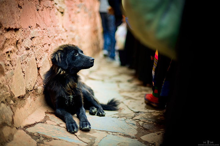 虔诚的信徒在耐心地排队守候,一只黑色的狗狗趴在一边