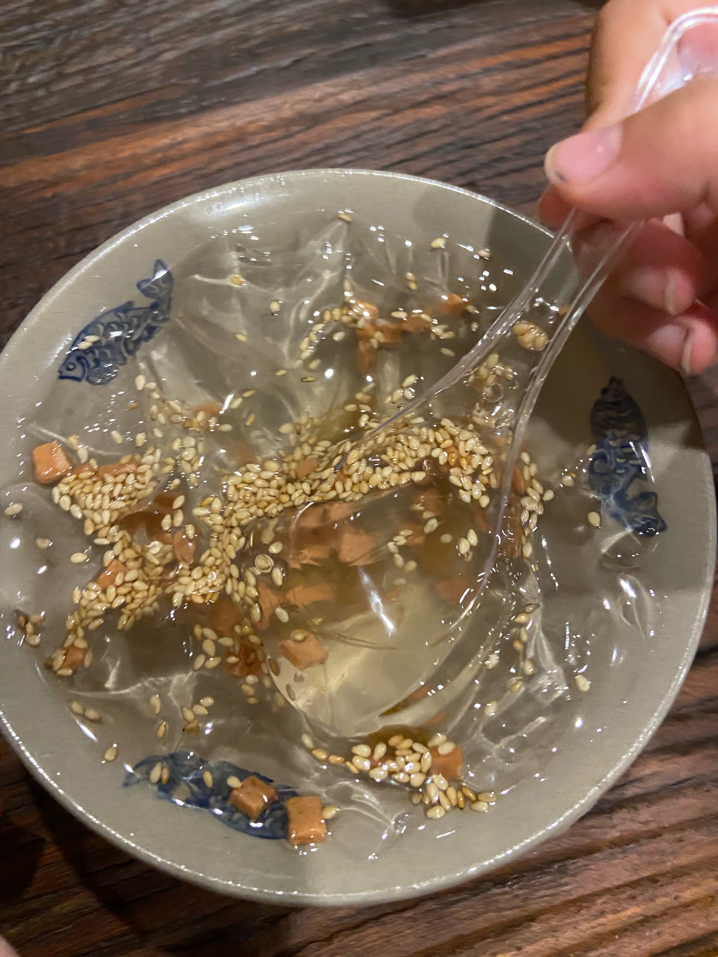 我们听了一首歌,就步行到老街担子小吃铺(路过的十字路口也是人超级多,长沙真的是人人人)。点了碗冰粉和春卷(口感不是我们喜欢的),一份小馄饨倒是全让滚滚吃完了。