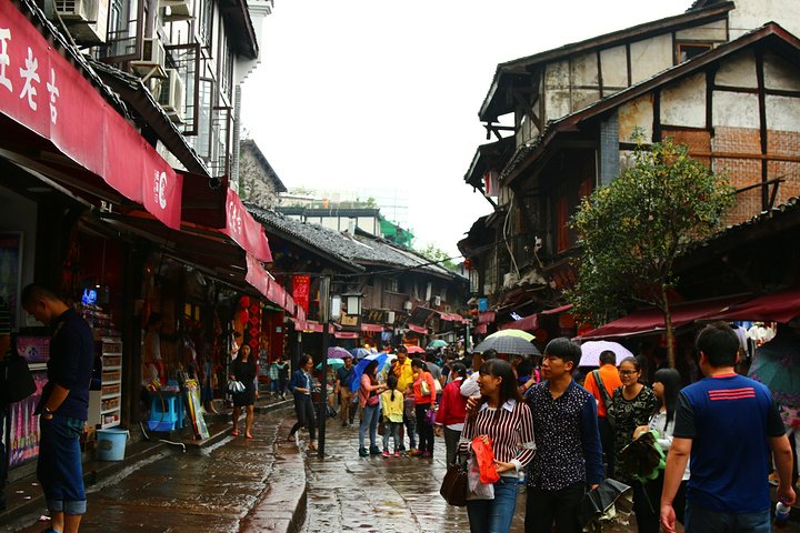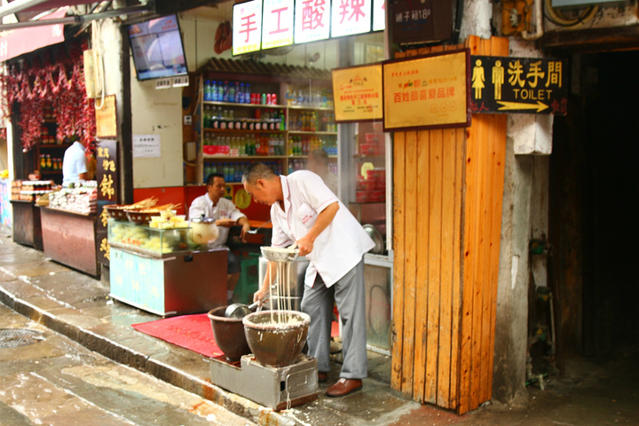 第二天一早,依旧是下雨天。睡到自然醒,叫上神州专车,前往磁器口,大概30分钟到达。别看雨一直下,但是气氛相当融洽,全是游客。我俩撑着一把小伞,走在湿漉漉的石板路上,开始逛古街。从磁器口正门往里走就会有一条丁字路口,我们选择的是向右方向继续前进,里边最多的就是卖手工酸辣粉的,师傅门口一边现场制作一边叫卖,其他的还有一些特色小吃,茶馆,戏楼应有尽有,由于雨下的非常大,刚开始并没有照太多照片,但是一路上人非常多,可以转的地方还是很多的,如果要是天气好的时候来人会更多。磁器口古镇尽头的码头上,仿佛还能感受当年水路码头,行船走车做买做卖的繁华