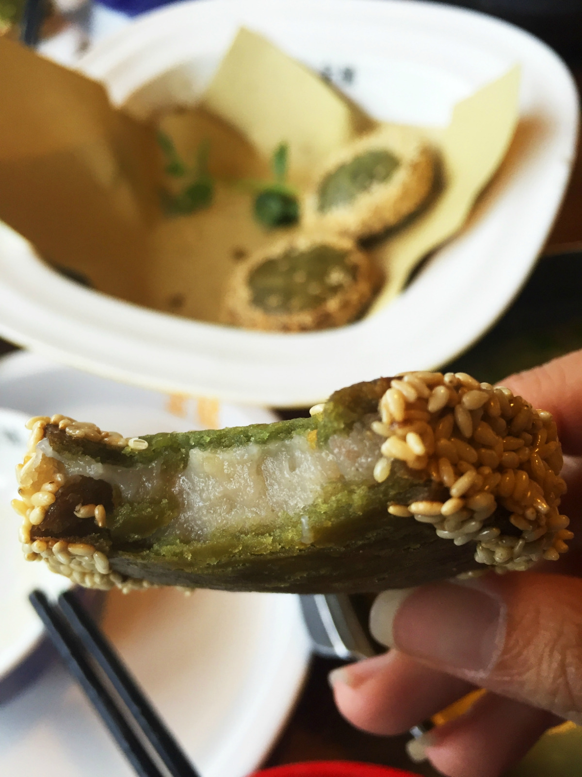 绿茶饼的馅尝起来是芋头+糯米的,新鲜出炉还冒着热气,甜度刚刚好,不会很黏也不会很腻,给五分好评!