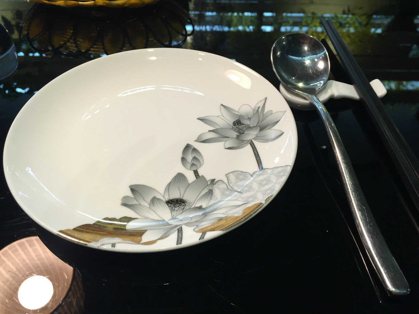 餐具看着不错儿,餐盘里也是有花儿的元素,汤勺看着也是很精致的。