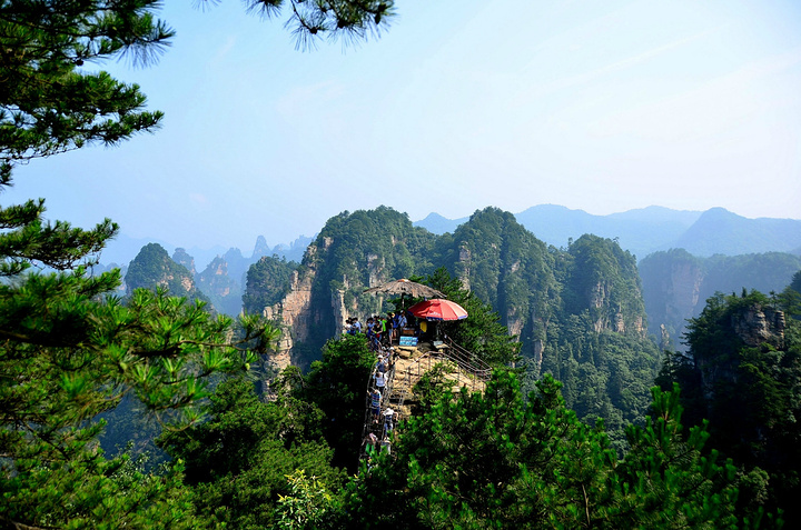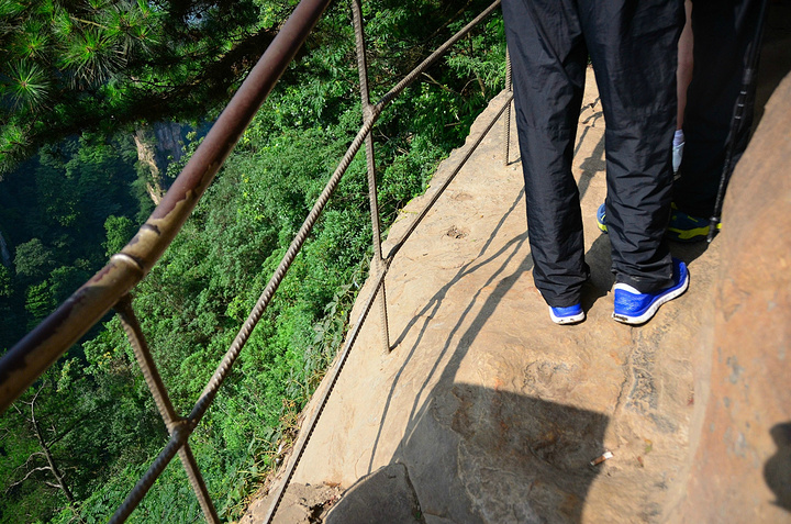 景点3:杨家界 从乌龙寨停车场步行15分钟左右有分岔口,右边通往乌龙寨、天波府,左边通往一步登天、空中走廊。 乌龙寨停车场出发,数分钟后,可见路右边有一条很窄的泥土小路,路口有路标写着去“一步登天”,不理会它,继续前行,约10分钟,到达“金鸡报晓”景点,附近有个小卖部。在此稍稍休息后,下坡走5—6分钟,可见一较大的餐馆,也有一些小卖部。这里是个三叉路口,选择往右边走先去乌龙寨和天波府,10分钟后到达乌龙寨门 A【乌龙寨】【天波府】时间1小时 【观赏指数】★★★★★ 去天波府小平台要过个木板索桥,走直上直下的小铁梯,但很值得上,一览众山小。(个人没敢去啊。。我脚抖。。。人又多。。不过现在有点后悔啊) 【游览时间】 四十五分钟左右。 【难易程度】台阶山路,某些路段很陡,但路程不长。 【拥挤程度】人很多啊。。大概出名了的原因 【交通】:回到三岔路口的餐馆边的石板平路(下面有个大型厕所)去“一步登天”和“空中走廊”。 B【一步登天】【空中走廊】 时间:3小时 5分钟后,石板路开始上坡,一路爬升,比较累,25分钟后看见第一个木制的售货亭,貌似是卖中草药的,里面有个五郎拜佛的景点,再前行约10分钟,可见第二个售货亭,里面也是空荡荡的。继续往前走10来分钟,到达第三个售货亭,这是一对年已八旬的老人开的店,可在此歇一下,吃个老人家卖的土鸡蛋。稍息后继续前行,15分钟后见到第四个售货亭,旁边就是“一步登天”。顺着石阶向上走几十米,爬一个几乎垂直的铁梯上观景台,风景这边独好。 从“一步登天”下来回到路上,走一段下坡路,约5分钟,路边有一块石碑路标,字迹已不甚清晰,这里有两条路,左边是很陡的下山道,右边比较平坦的路通向“空中走廊”。从这里到空中走廊大约要走15分钟,路不太难走,不过有一段是贴着悬崖削壁的,因为有扶栏,虽不危险,但也让人心悬。“空中走廊”观景台在路的尽头,一块突出的岩石上。在这里看景,玩的就是一个心跳! 从“空中走廊”往回走,40分钟后回到第二个售货亭处,注意路右边有条林间泥土小路,有路标显示可通往天下第一桥。走进去不远,可明显看见向左和右前方各有一条路痕,沿着左边的小路大约10分钟就走到通往乌龙寨停车场的路上,继而再走到停车场。 【观赏指数】★★★★★ 走路很辛苦,途中风景不多。如果最后只看一步登天,实在有些遗憾。亮点在空中走廊,最后的观景平台可以看到完全不一样的风景。切记,一定要走完400米的空中走廊,否则功亏一篑。。 【游览时间】大约2个半小时。 【难易程度】完全是上上下下的山路,体力消耗很大。这是张家界最艰难的一个景点。 【拥挤程度】幽静。因为强度大,自助游客都不多。 【PS】:想去老屋场的朋友注意下时间的安排,早上一定要早点过去~ 【交通】:从乌龙寨停车场乘中巴往天下第一桥方向