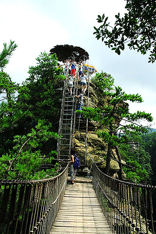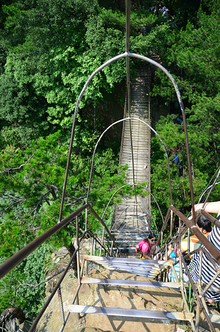 胆战心惊地过了左右摇摆的索桥,眼角的余光扫了身旁两侧深不见底的悬崖和山谷,脚都有些不由自主地开始打颤。走过索桥,面前便是两架垂直90度的登山扶梯,真是一波未平一波又起,这回眼睛都不敢往下瞄,一鼓作气爬到了天波府观景台。