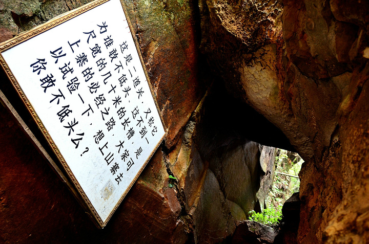 继续前进的路悄然间又不那么分明,钻洞绕石,似路非路,几米外便难见人,百余米的路,艰难曲折,人需要弯腰才能上行。这就是第二关“谁能不低头”:条状山石斜搭在一旁,如筑洞般挡在曲折的石阶之上,让人不得不低头弯腰而过。人在石头下,不得不弯腰。