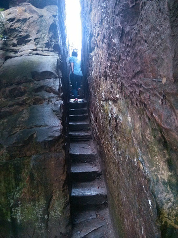 进门就是一段陡峭的石级,便“遭遇”第一关:“一步难行”。小路一个急弯向右,一块尖利的岩石“当仁不让”地突兀而出。