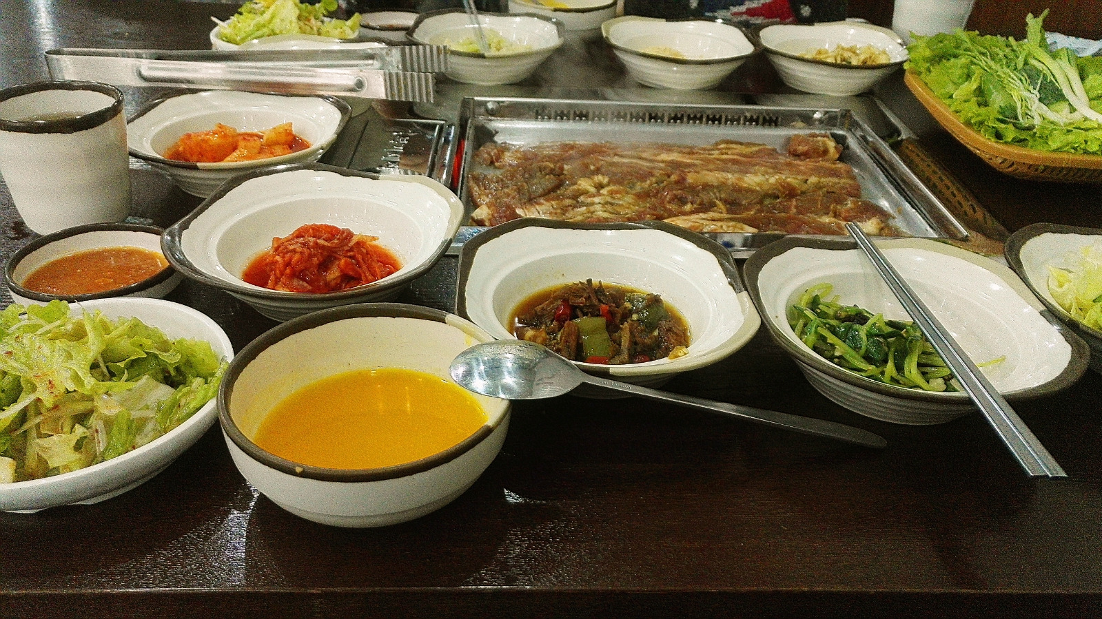 说到这儿,不得不说就是店里所赠的小菜,总共十二样,包括南瓜粥、辣白菜、酸萝卜、年糕、海带丝、豆腐丝、蔬菜沙拉等等,其中南瓜粥可以无限量续杯的!!!